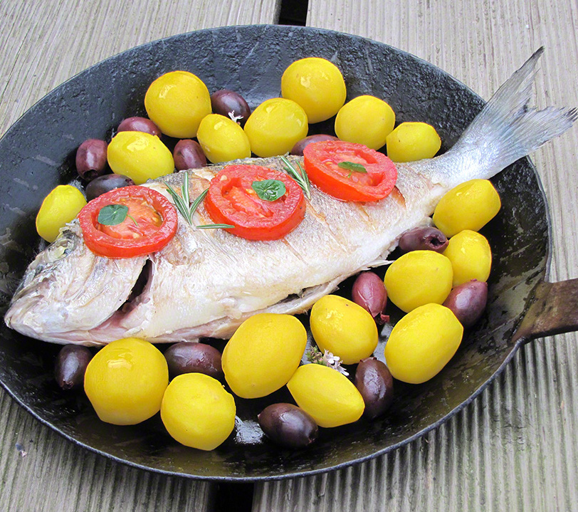 Dorade mit Safran-Kartoffeln, Tomaten und grüner Olivada